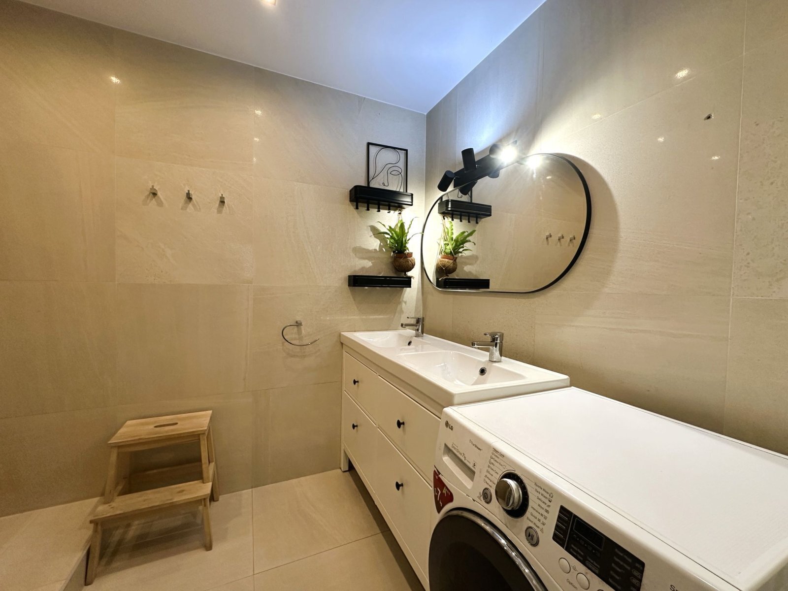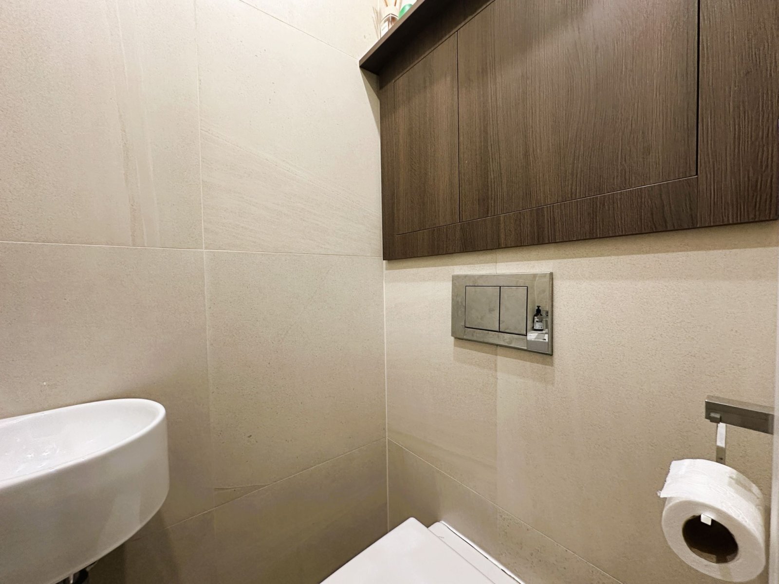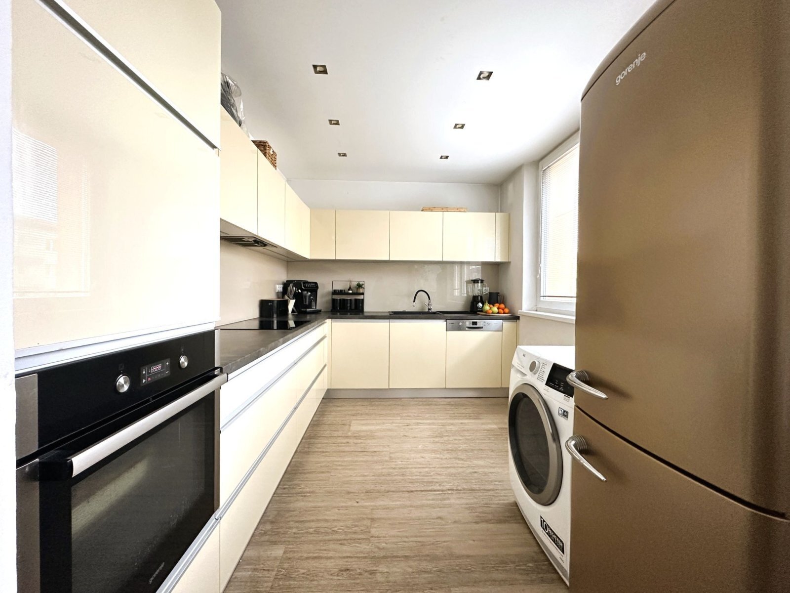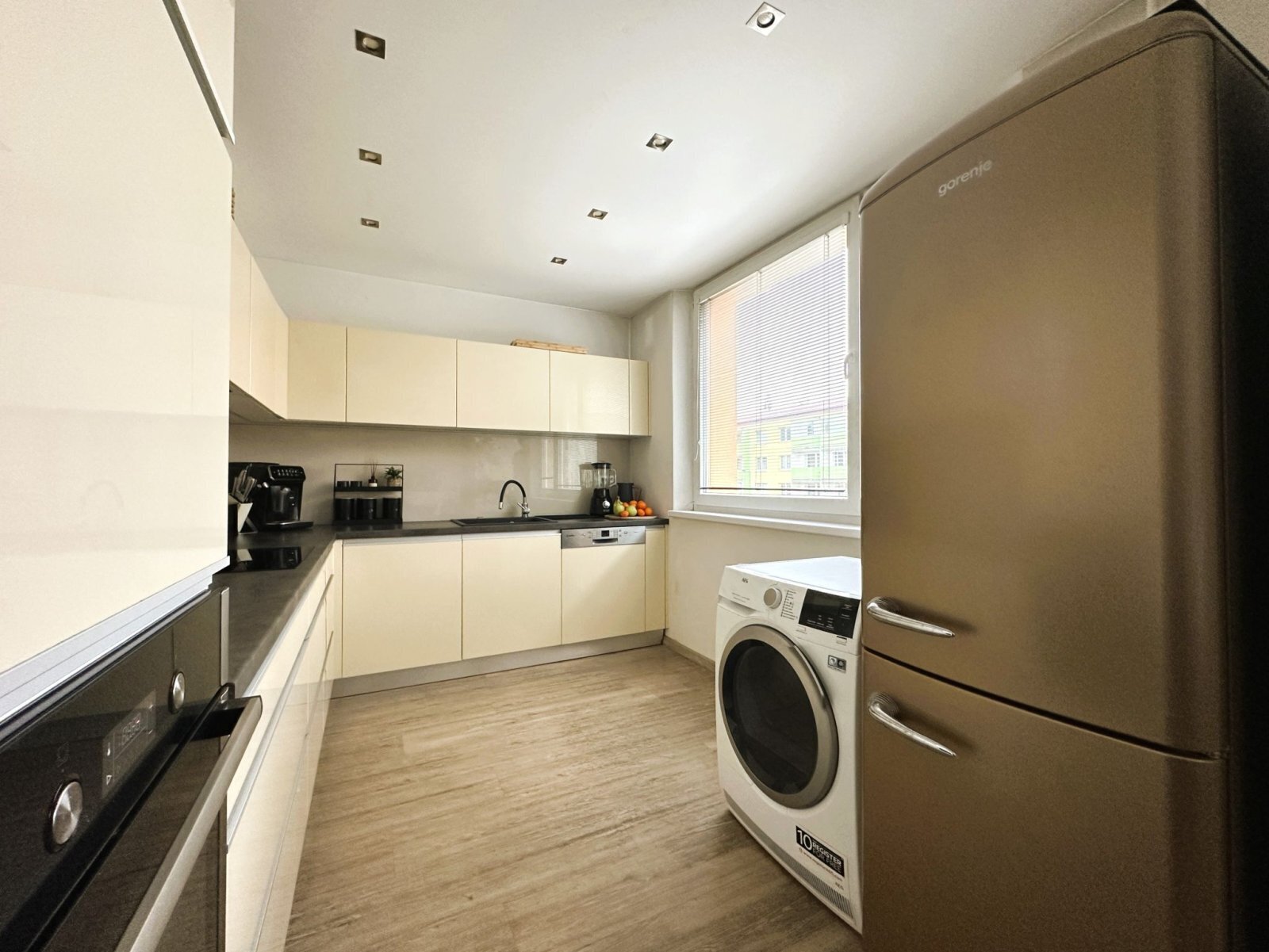 Kuchyně je vybavena novou kuchyňskou linkou s dřezem, indukční varnou deskou, troubou, digestoří a myčkou nádobí. Koupelna nabízí velký sprchový kout, otopný žebřík, dvojité umyvadlo, úložné skříňky a přípojku na pračku a sušičku, WC je samostatné. V bytě jsou instalovány žaluzie.