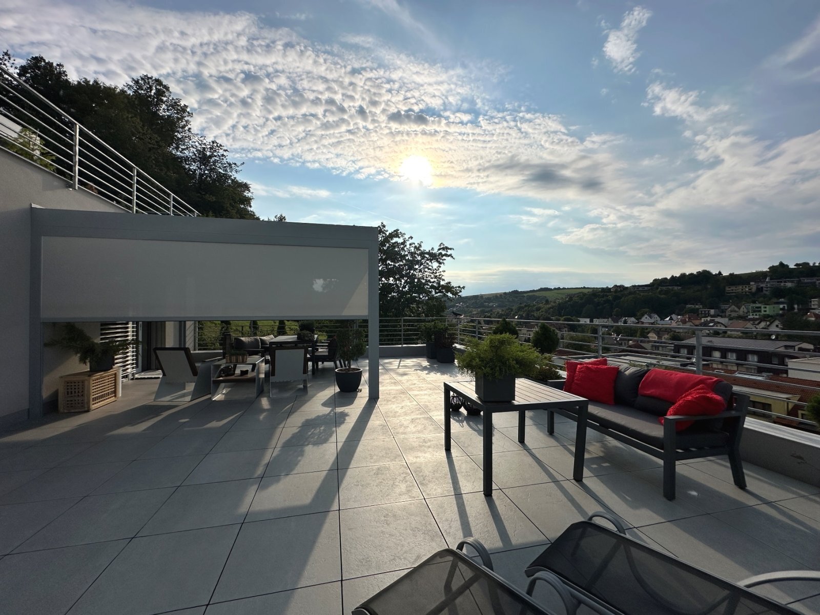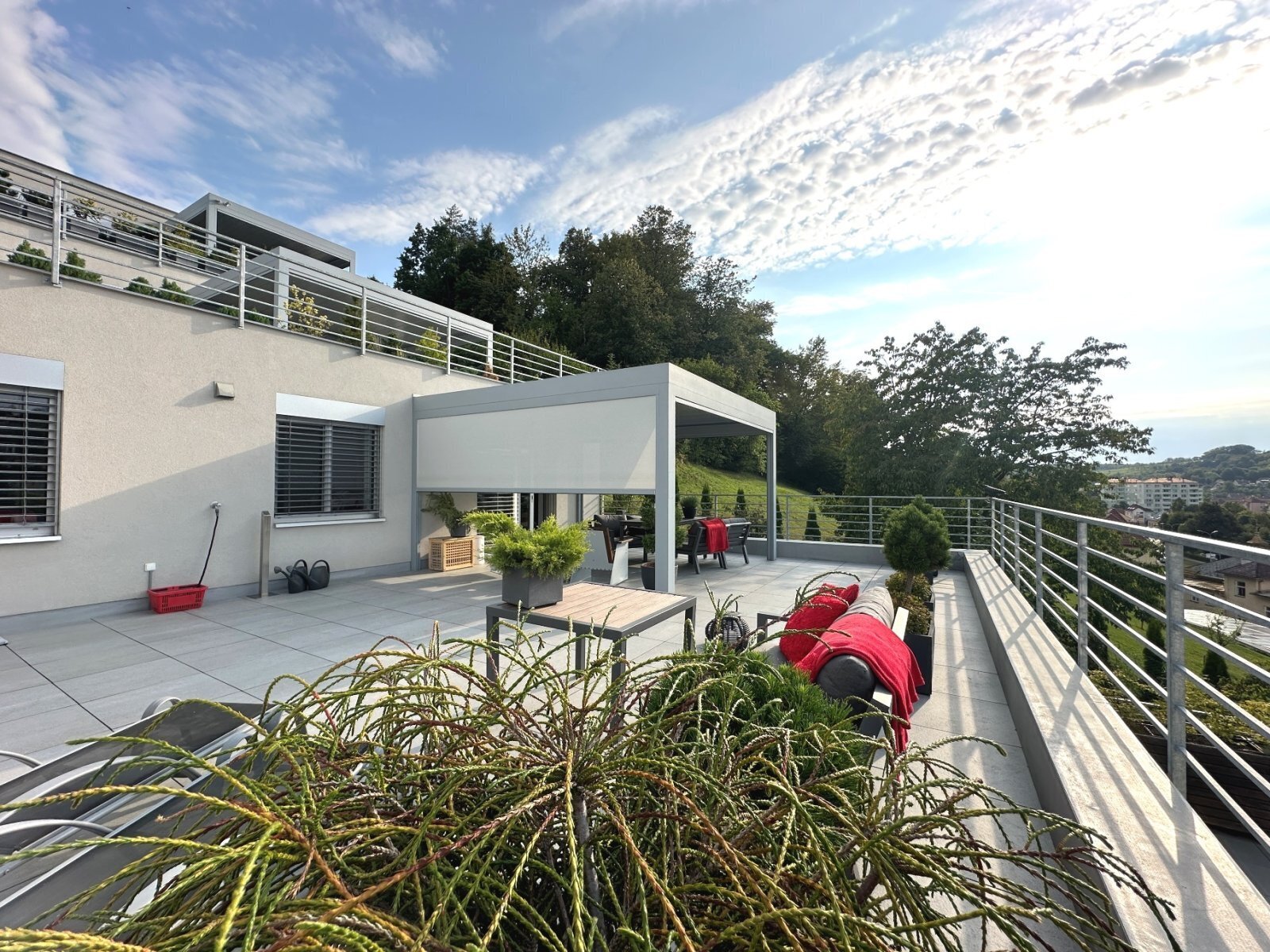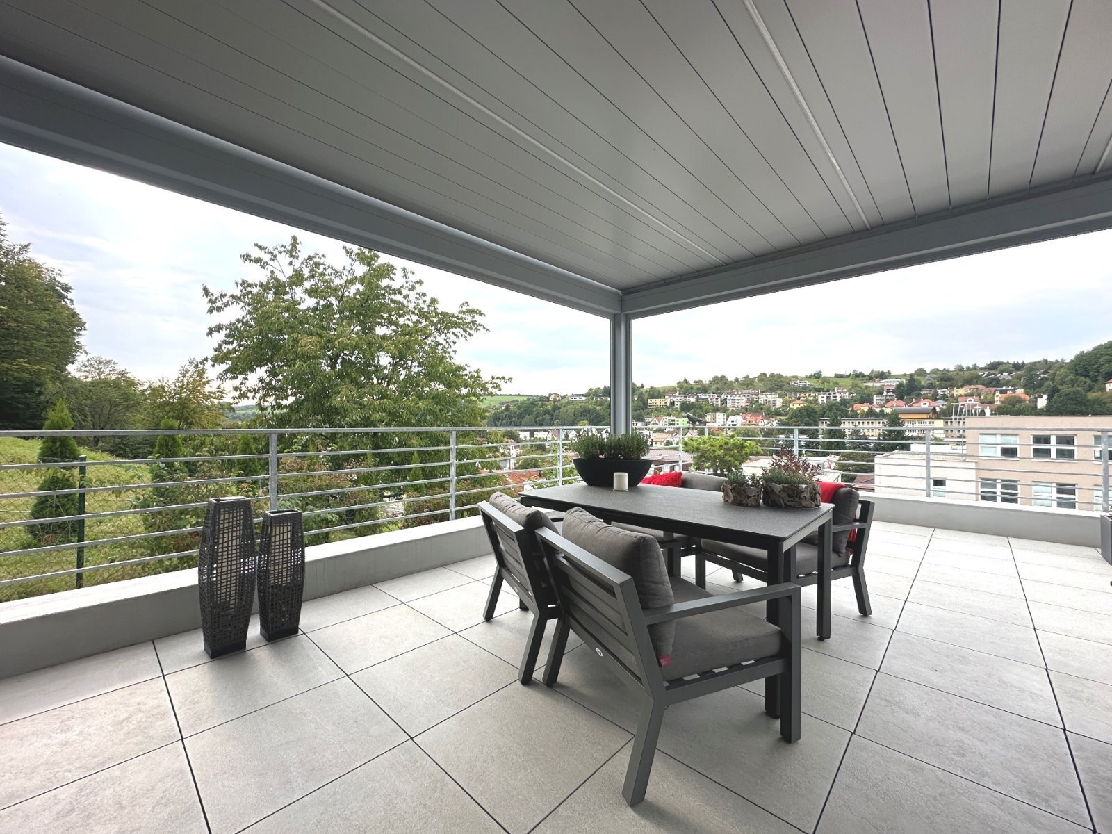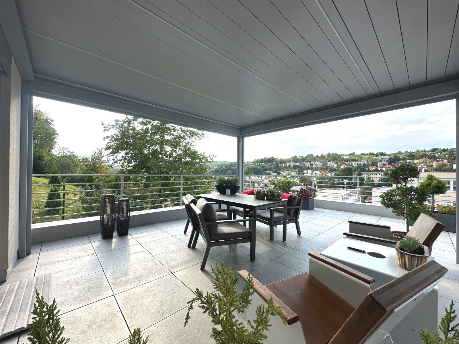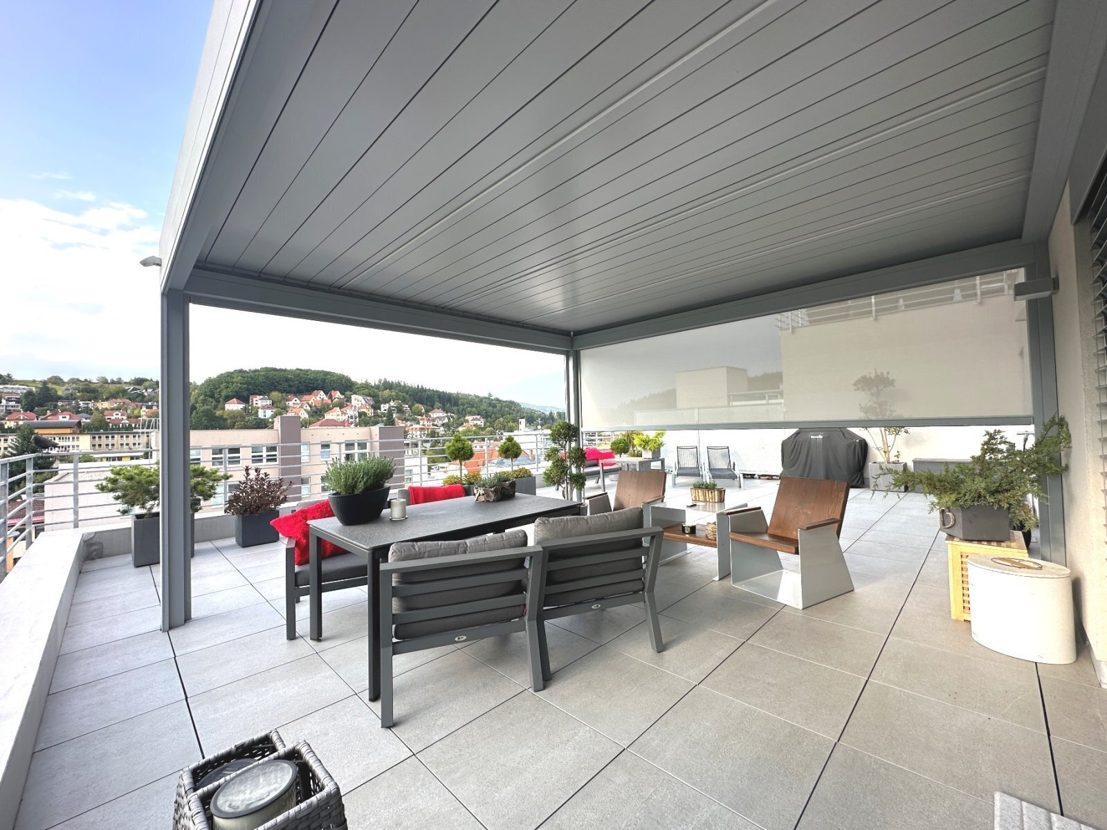 - zastřešená terasa s otevíracími lamelami vybavená elektřinou, vodou, LED osvětlením a možností zastínění roletami