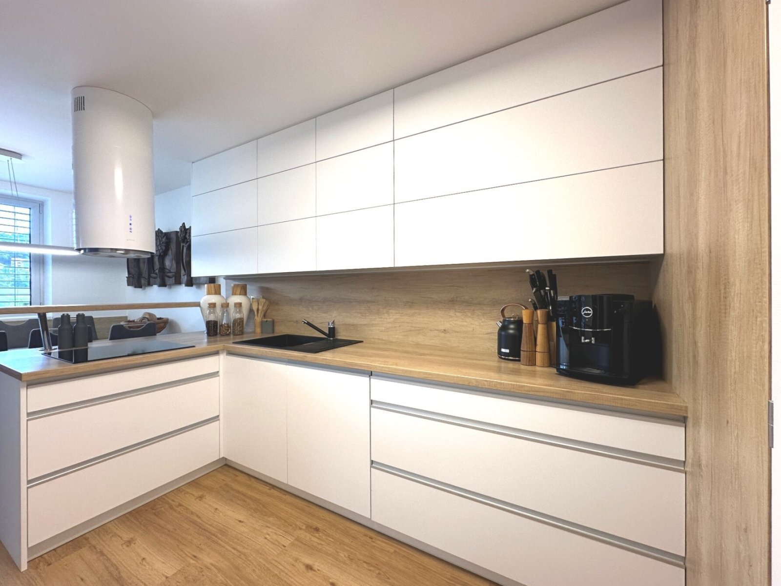 - kuchyně s moderní kuchyňskou linkou (indukční varná deska, vestavná lednice, mikrovlnná trouba, myčka, elektrická trouba, digestoř), barem a jídelním koutem se stolem a 6 židlemi