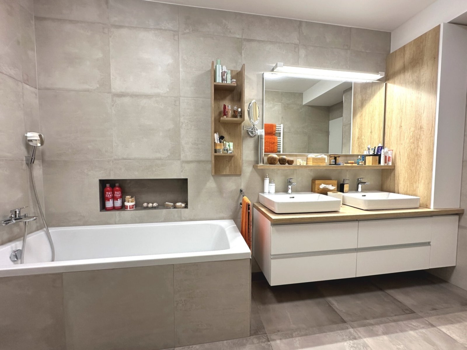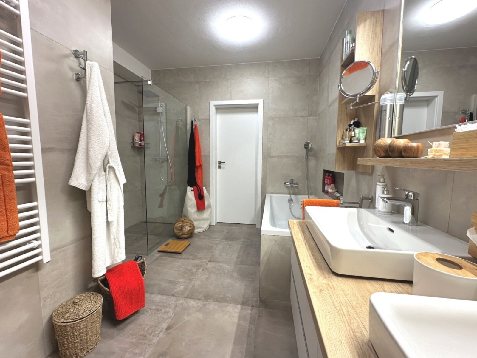- prostorná koupelna s dvojitým umyvadlem, sprchovým koutem a vanou