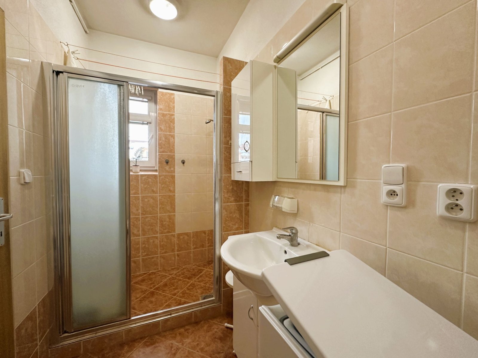 - koupelna s oknem: sprchový kout, umyvadlo, WC a místo pro pračku