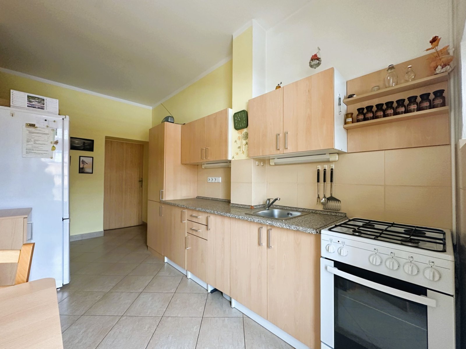 - kuchyňská linka: elektrická trouba, plynový sporák, dřez, prostor pro lednici a jídelní stůl