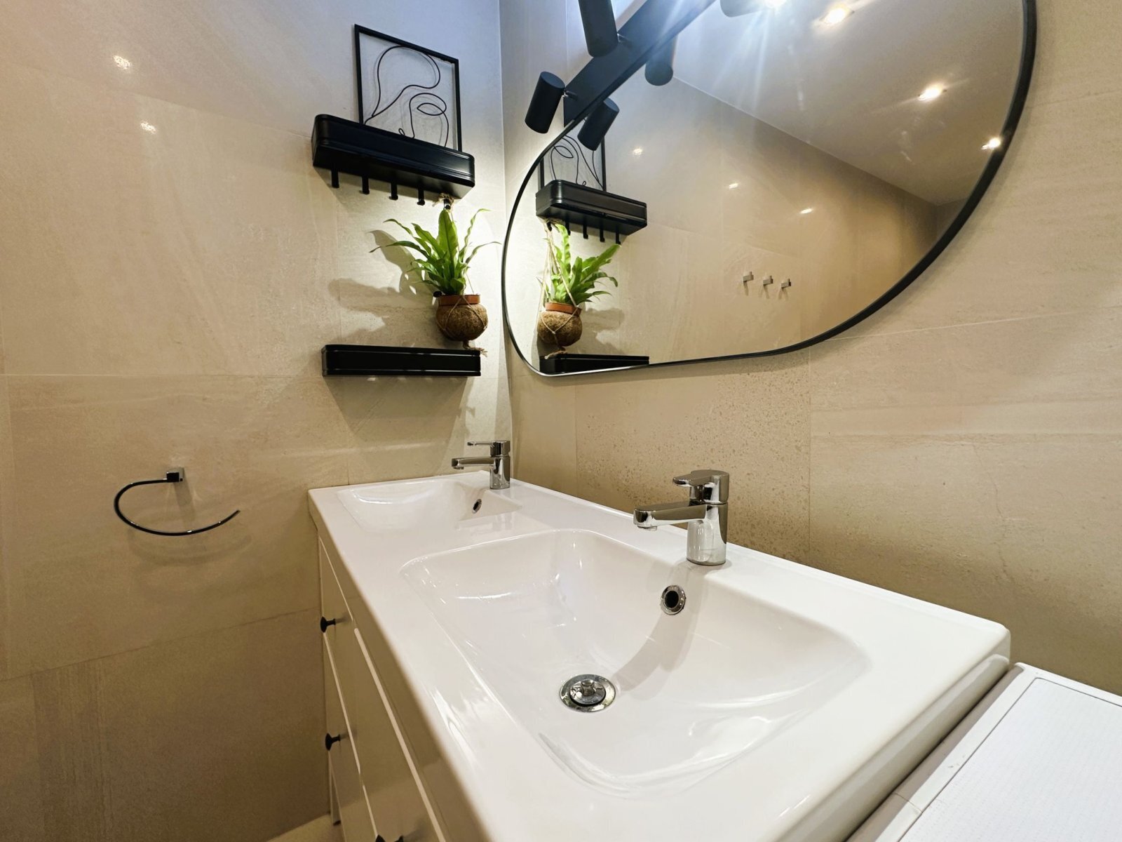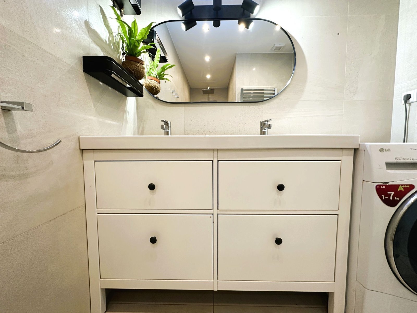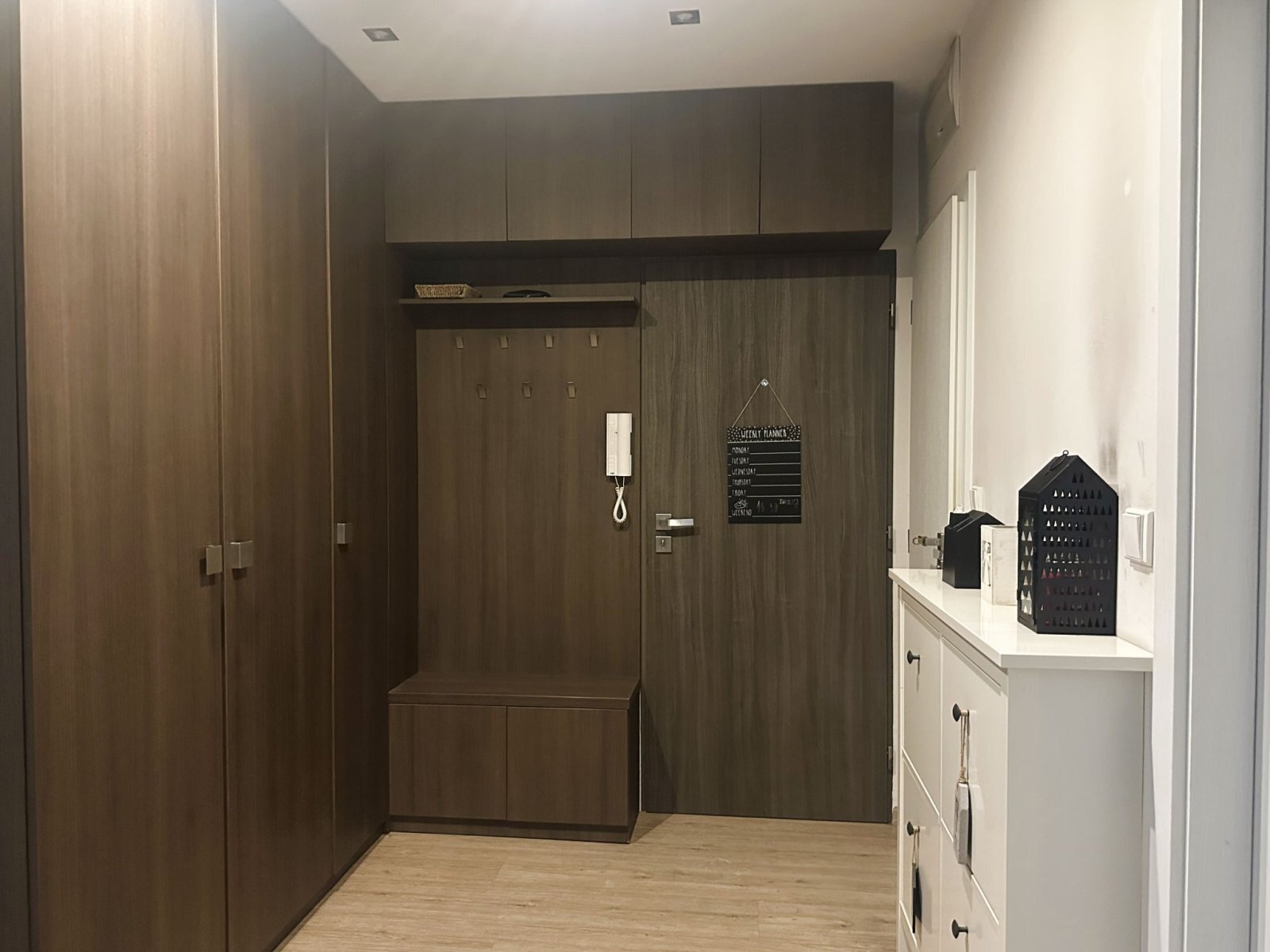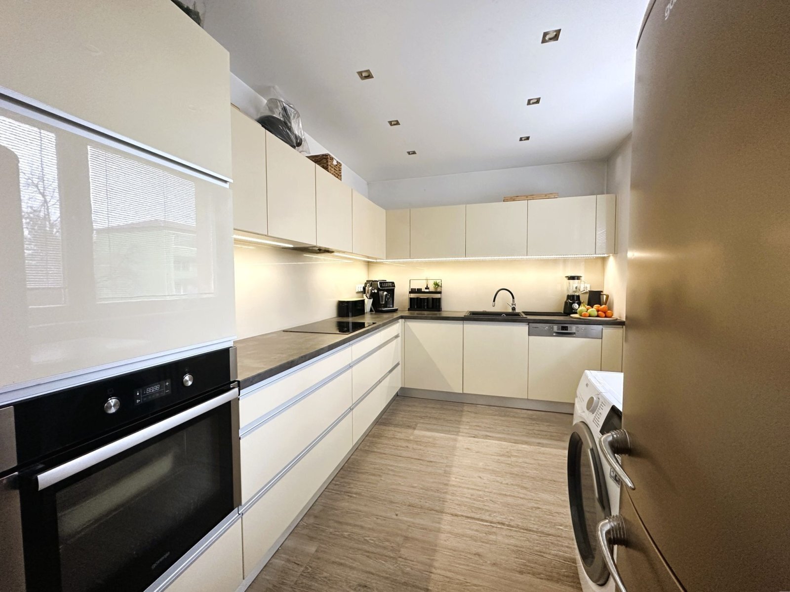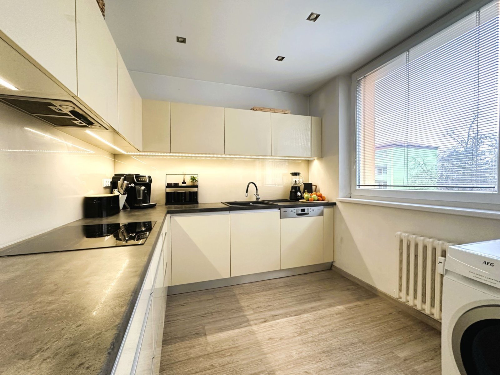 Kuchyně je vybavena novou kuchyňskou linkou s dřezem, indukční varnou deskou, troubou, digestoří a myčkou nádobí. Koupelna nabízí velký sprchový kout, otopný žebřík, dvojité umyvadlo, úložné skříňky a přípojku na pračku a sušičku, WC je samostatné. V bytě jsou instalovány žaluzie.