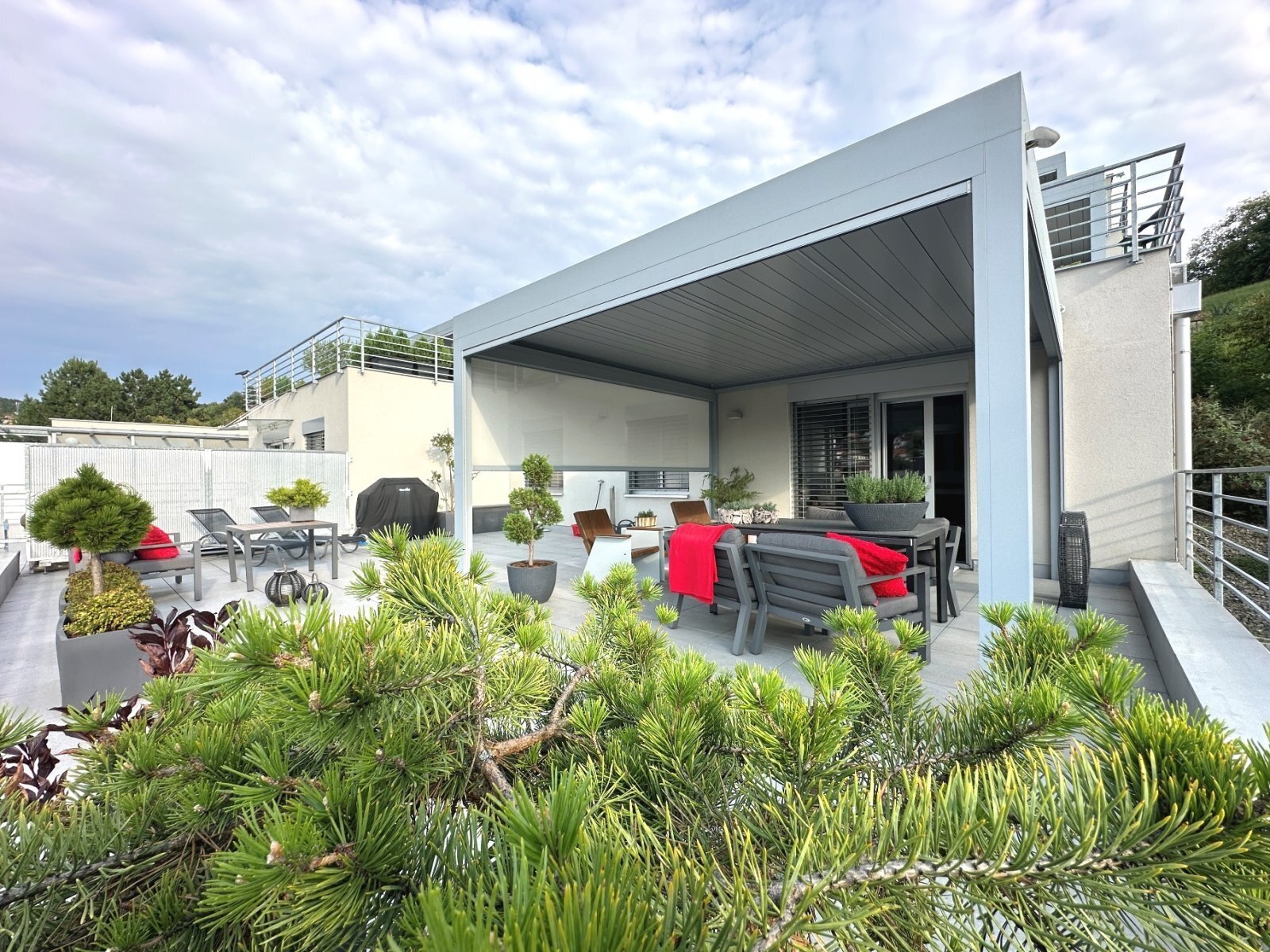 - zastřešená terasa s otevíracími lamelami vybavená elektřinou, vodou, LED osvětlením a možností zastínění roletami
