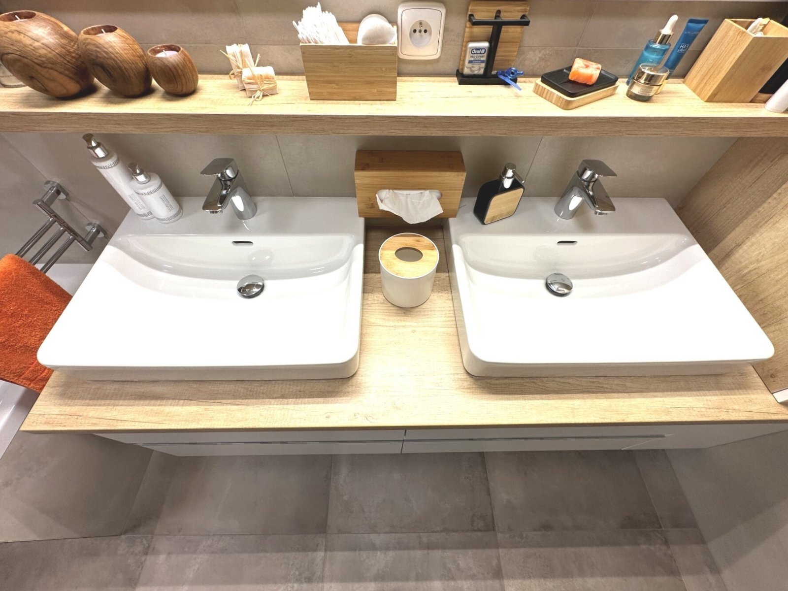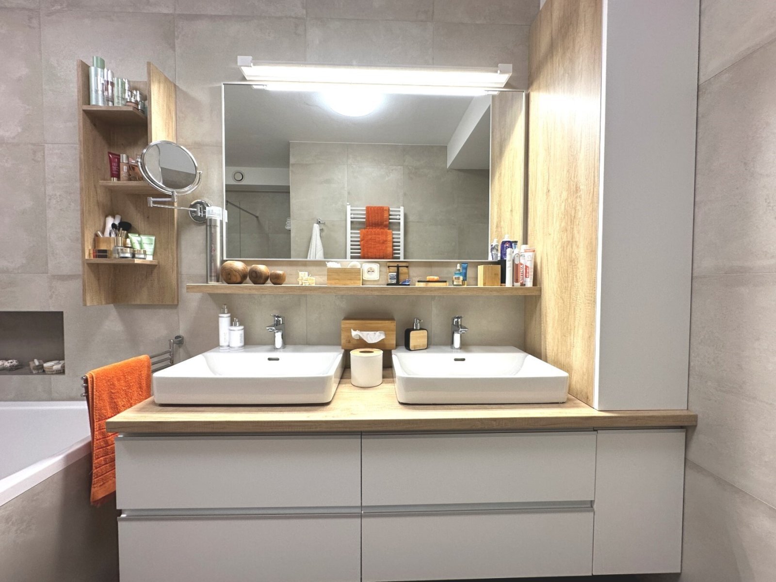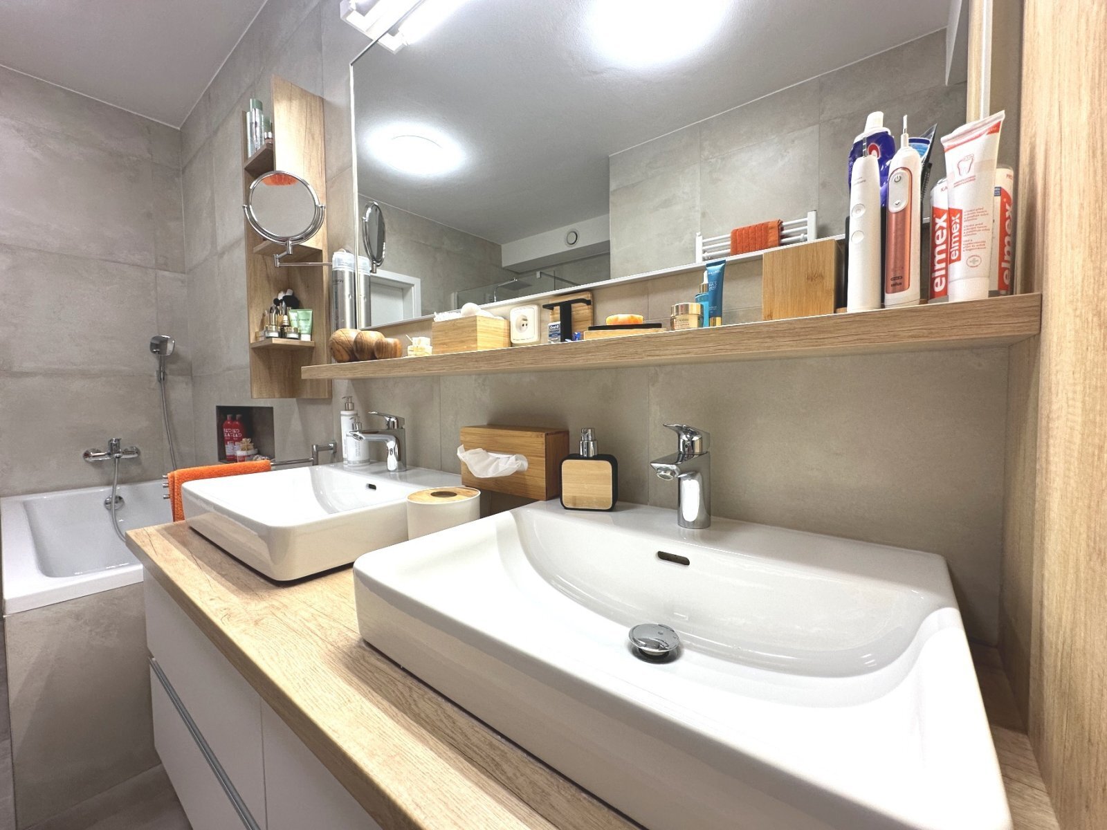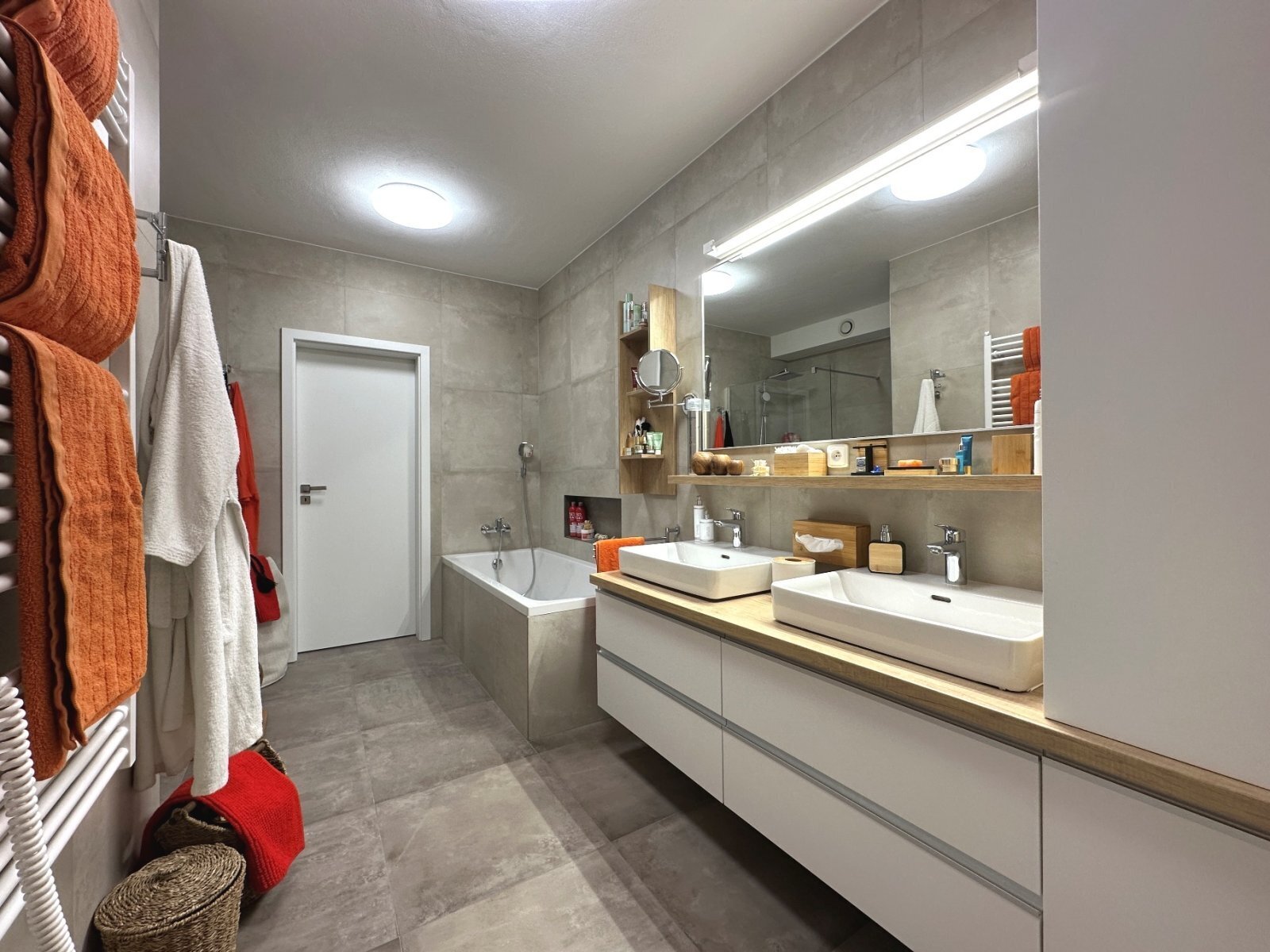 - prostorná koupelna s dvojitým umyvadlem, sprchovým koutem a vanou