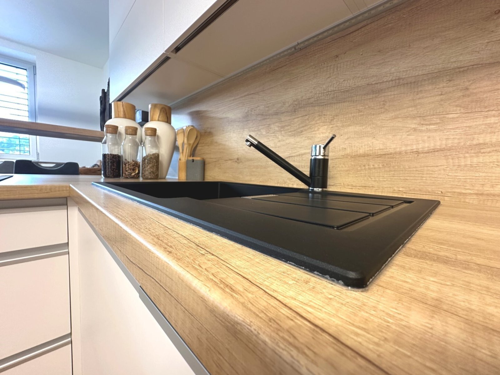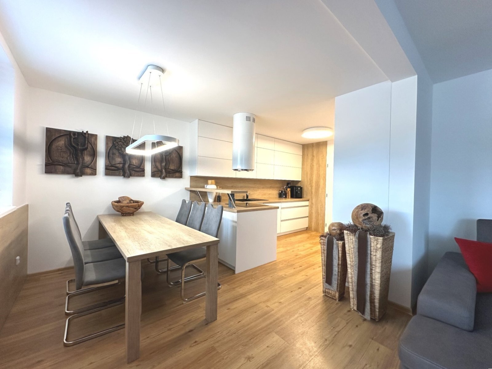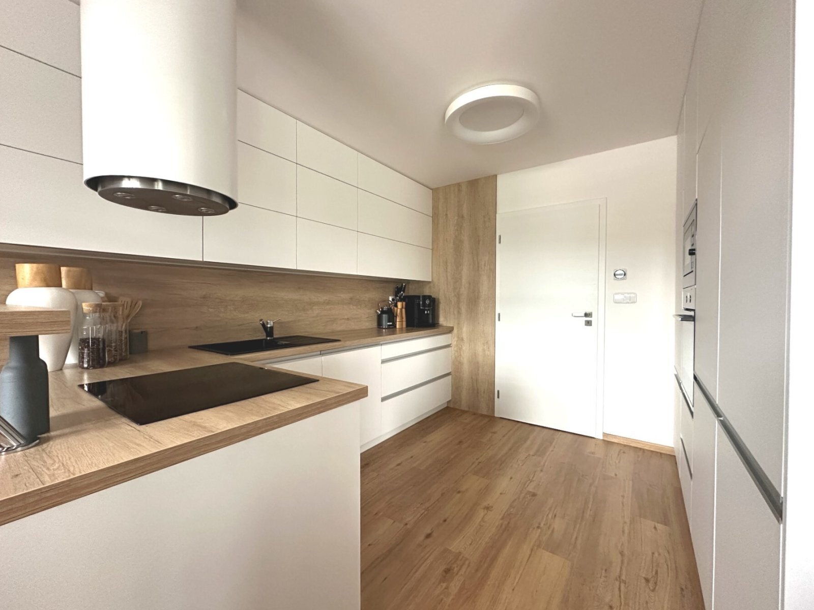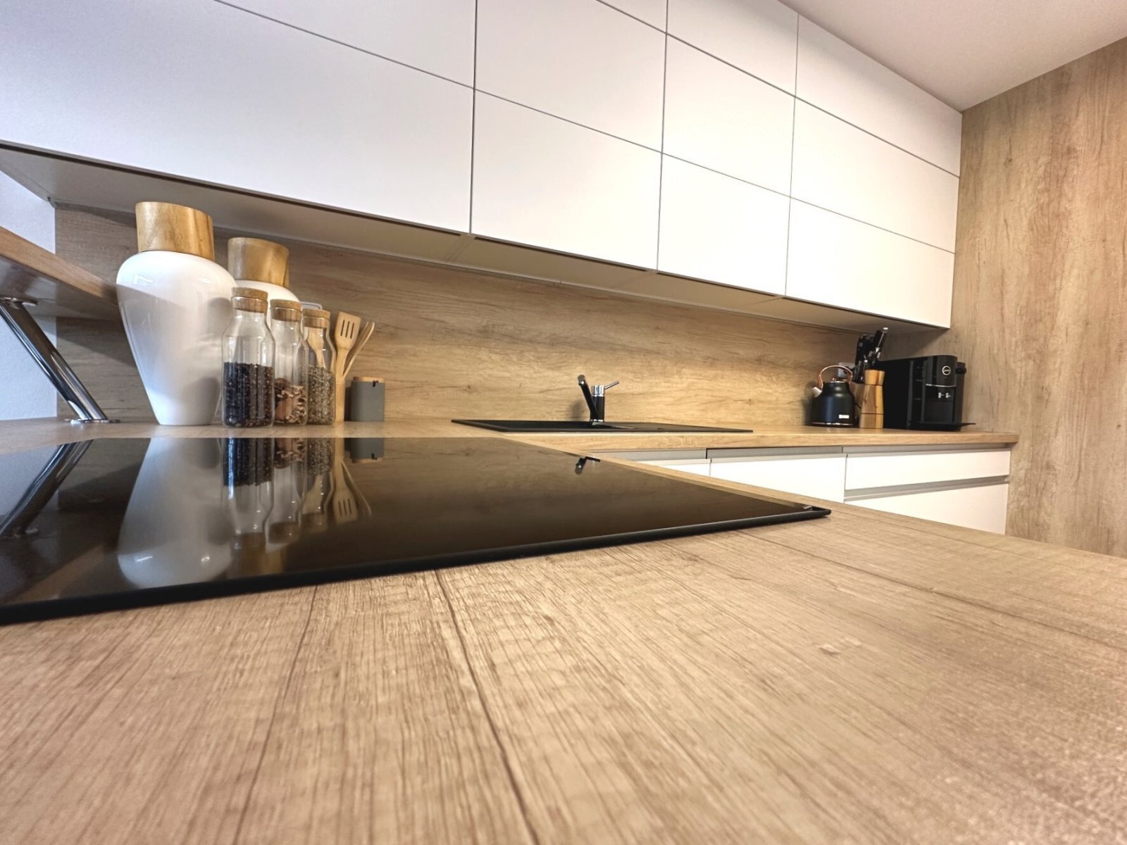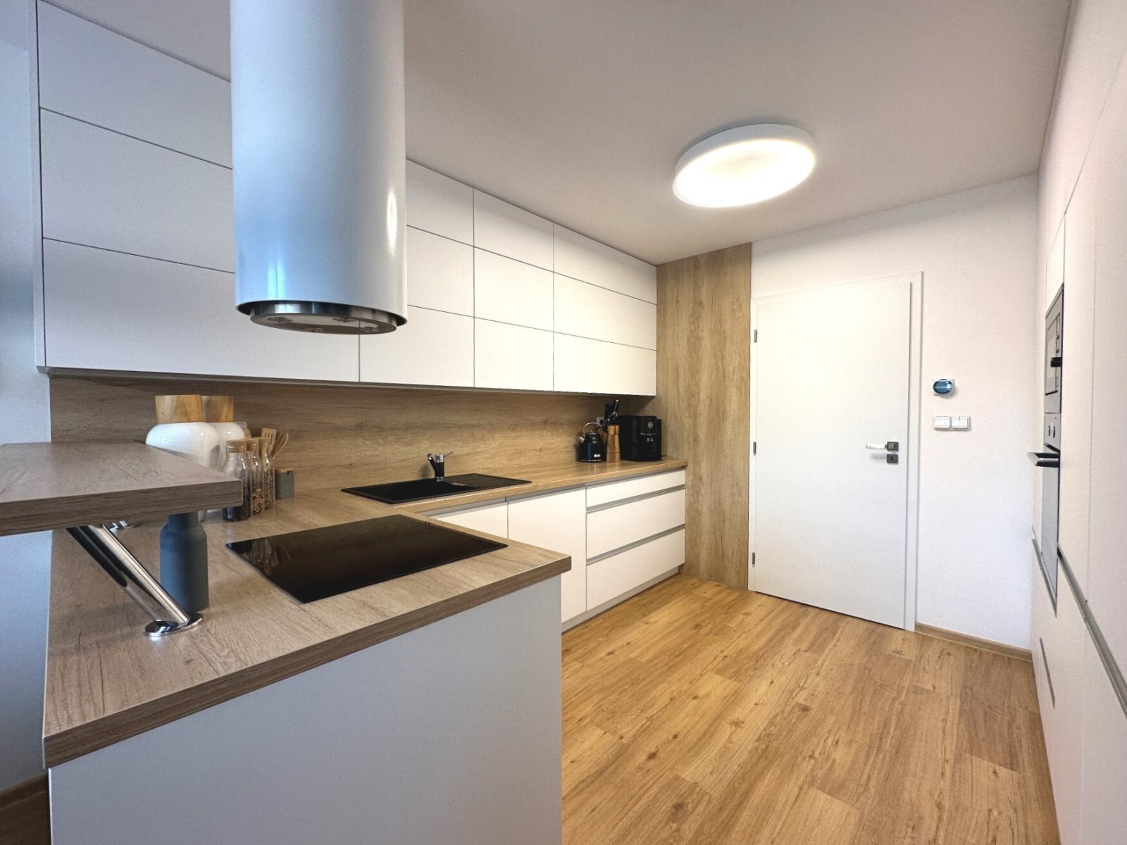 - kuchyně s moderní kuchyňskou linkou (indukční varná deska, vestavná lednice, mikrovlnná trouba, myčka, elektrická trouba, digestoř), barem a jídelním koutem se stolem a 6 židlemi