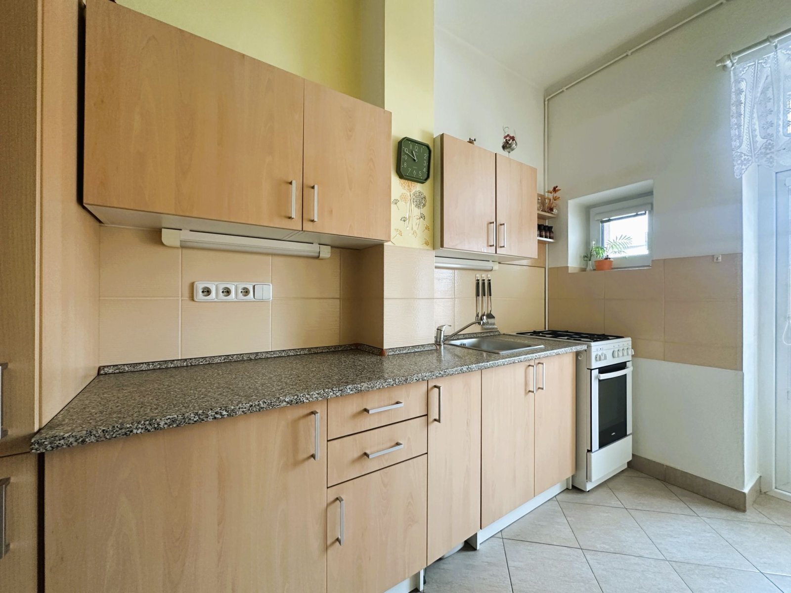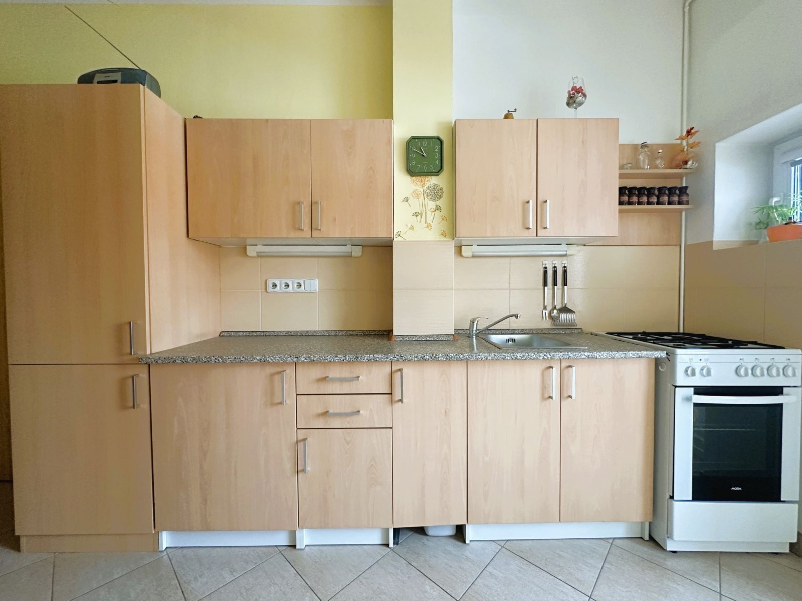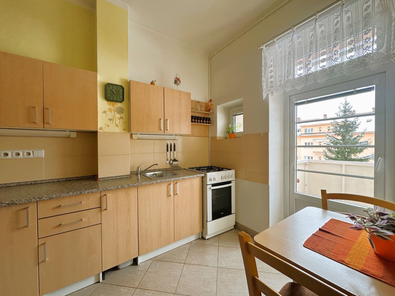 - kuchyňská linka: elektrická trouba, plynový sporák, dřez, prostor pro lednici a jídelní stůl